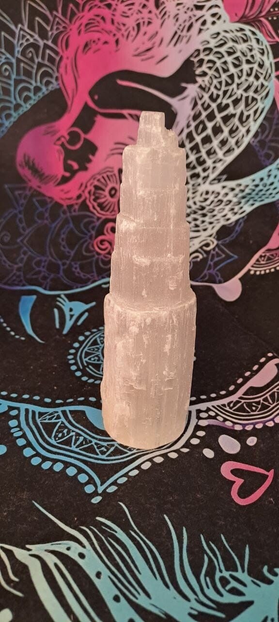 La torre de selenita, una variedad del mineral yeso, se usa principalmente para la protección contra malas energías, aporta tranquilidad, comprensión, claridad mental y ayuda en algunos procesos de sanación.