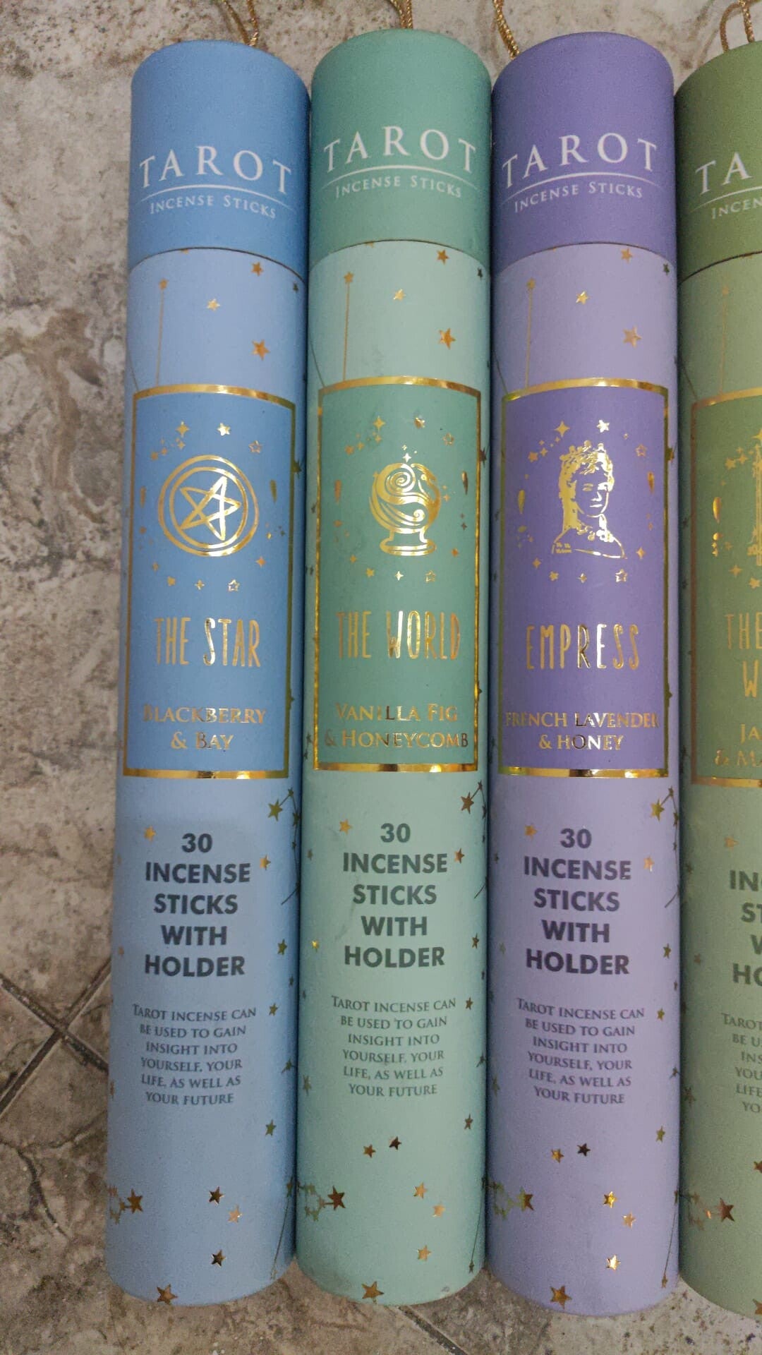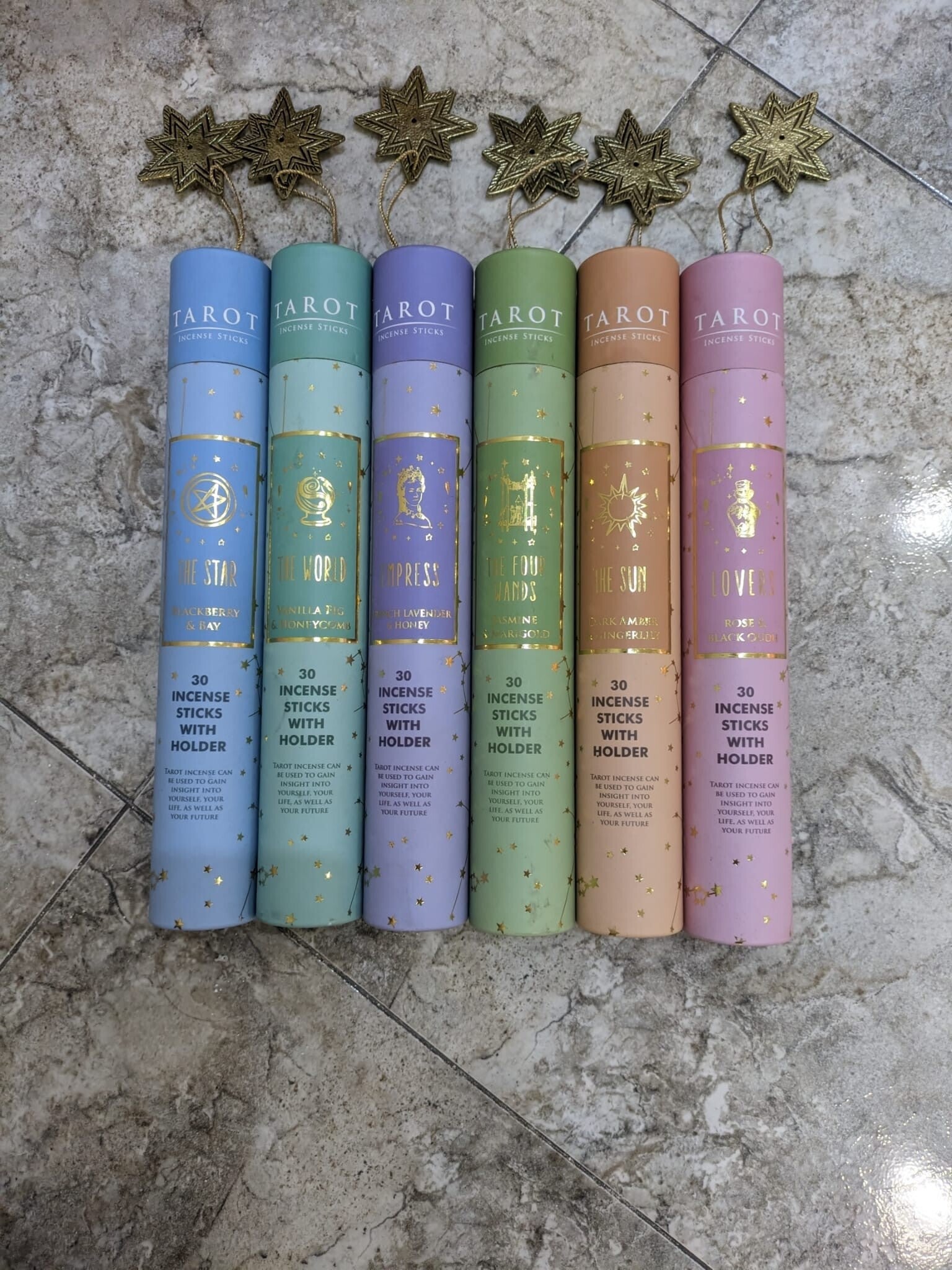 Colección Tarot: 30 varillas de incienso y un quemador de diseño. Cada varilla, cuidadosamente elegida, representa una carta única del tarot, liberando aromas que evocan sus significados simbólicos. El elegante quemador crea un ambiente místico. Experimenta la conexión entre los aromas y el tarot, elevando tu espacio a una experiencia sensorial profunda. Con esta colección, cada quemada se convierte en una sesión aromática y espiritual. Descubre el poder del tarot y los aromas.